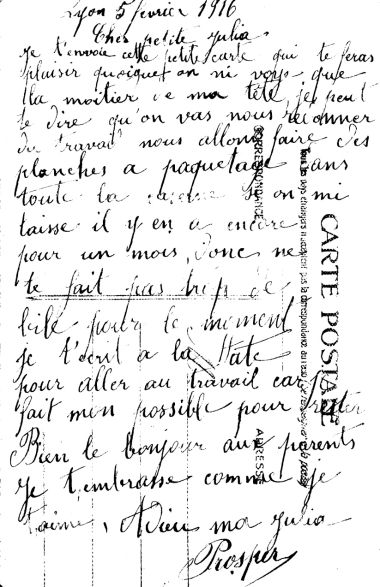 On ne sait à peu près rien de la jeunesse de Prosper. Il se marie avec Julia le 23 Septembre 1911. Il n'y a malheureusement pas de photo du mariage.