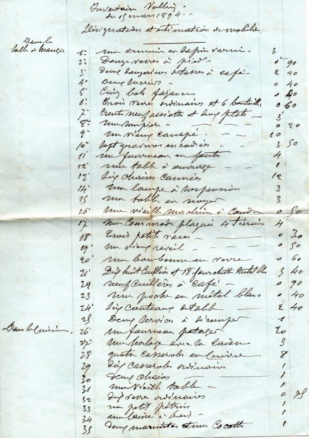 Ce document date du 15 mars 1894, soit une semaine après la disparition de Julie DUFFOURD, veuve de deux des frères VULLIEZ. Il détaille et estime l'ensemble des meubles de sa maison d'habitation. On aimerait bien savoir où est la maison en question, mais pour l'instant, mystère.