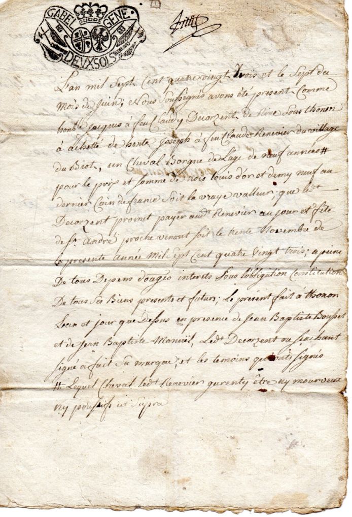 Toutes les transactions de quelque importance faisaient l'objet de contrats dûment enregistrés devant témoins, et qui nous sont précieux pour nous glisser dans la peau de nos ancêtres... Joseph à feu Claude Renevier (l'un des demandeurs de la coupe de bois pour sa maison) vend un cheval borgne. C'est certainement l'acheteur qui lui fait préciser en bas de page : "lequel cheval ledit Renevier garanty être ny mourveux ny poussif"