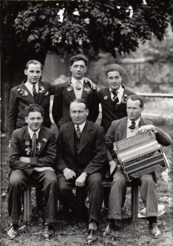 Albert (classe 33) pose avec ses collègues de l'année suivante. Au premier rang, Paul Tournier dit Malto, le maire Henri Premat, Marc Geydet (dit à Païen)