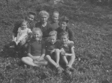 Mémé, Juliette et Christiane, avec à droite, Marie et les 3 garçons: Henri, Pierrot et Fernand. La jeune fille est Nicole MOREL